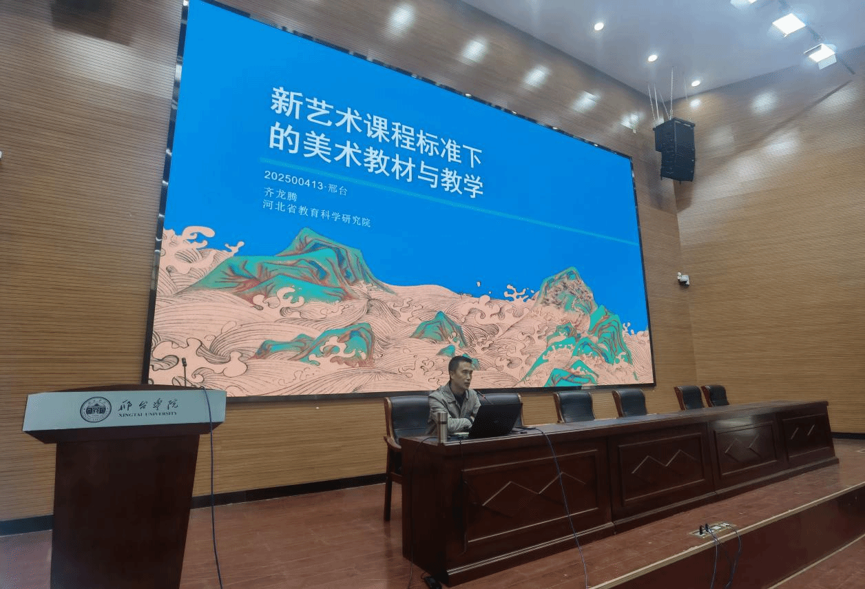 2025年4月13日上午,河北省教育科学研究院艺术教研员、冀美版教材主编、省特级教师齐龙腾老师应邀赴邢台学院,为正在进行的“国培计划(2024)省级骨干教师(初中美术)培养对象培训项目”作《新艺术课程标准下的美术教材与教学》专题讲座。讲座现场座无虚席,150名市级美术骨干教师和百余名美术学本科生一起聆听了讲座。