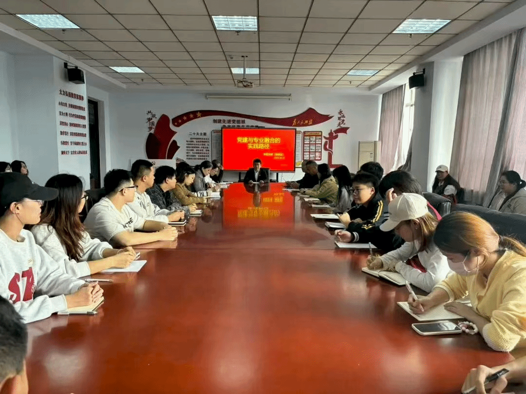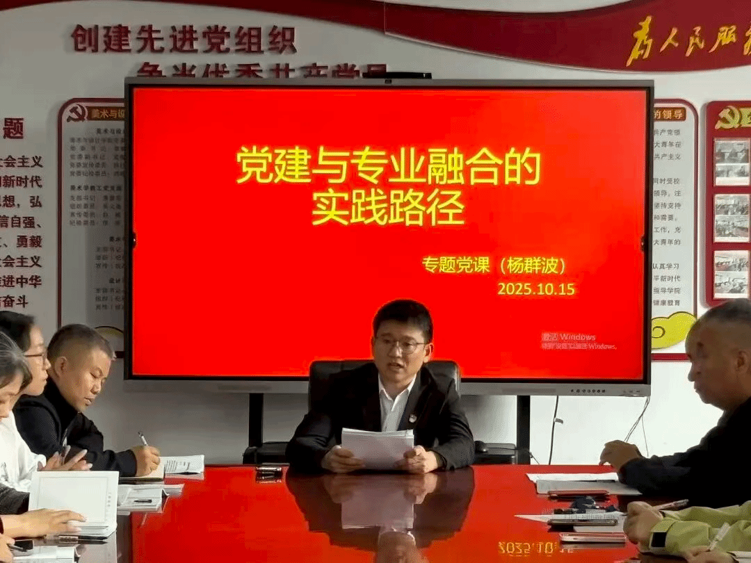 会议在庄严的入党誓词声中拉开序幕。全体学生党员在杨群波的带领下,面向鲜红党旗,高举右拳,重温入党誓词。坚定了学生党员们“勤学笃行、不负韶华”的信念,凝聚了以先锋行动践行“德艺双馨”的价值追求和以艺术创作服务社会人民的思想共识。随后,以《党建引领铸魂赋能:学生党员在专业学习中实现政治素养与专业能力双提升》为题,为全体学生党员讲授了一堂深刻务实的专题党课。他指出,推进党建与专业融合的核心在于构建“政治素养”与“专业能力”相互促进的共生机制,通过个体成长、专业建设与社会服务三者协同,实现高质量发展。他强调,此项工作是落实立德树人根本任务的“铸魂工程”,是服务国家战略需求的“赋能工程”,也是强化基层党组织功能的“固本工程”。进一步详细阐述了 “三位一体”融合体系,一是深化理论浸润,推动课程思政与专业知识点有机衔接,实现价值引领与知识传授同频;二是加强实践淬炼,设立红色主题创作等项目化实践载体,让学生党员在实践中锤炼提升能力;三是注重创新转化,完善“党员1+N”传帮带等制度保障,将融合成果转化为长效机制。