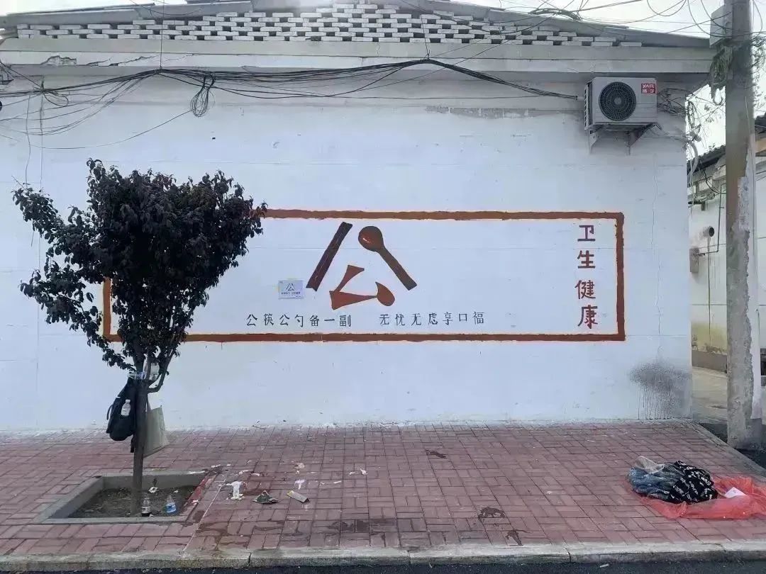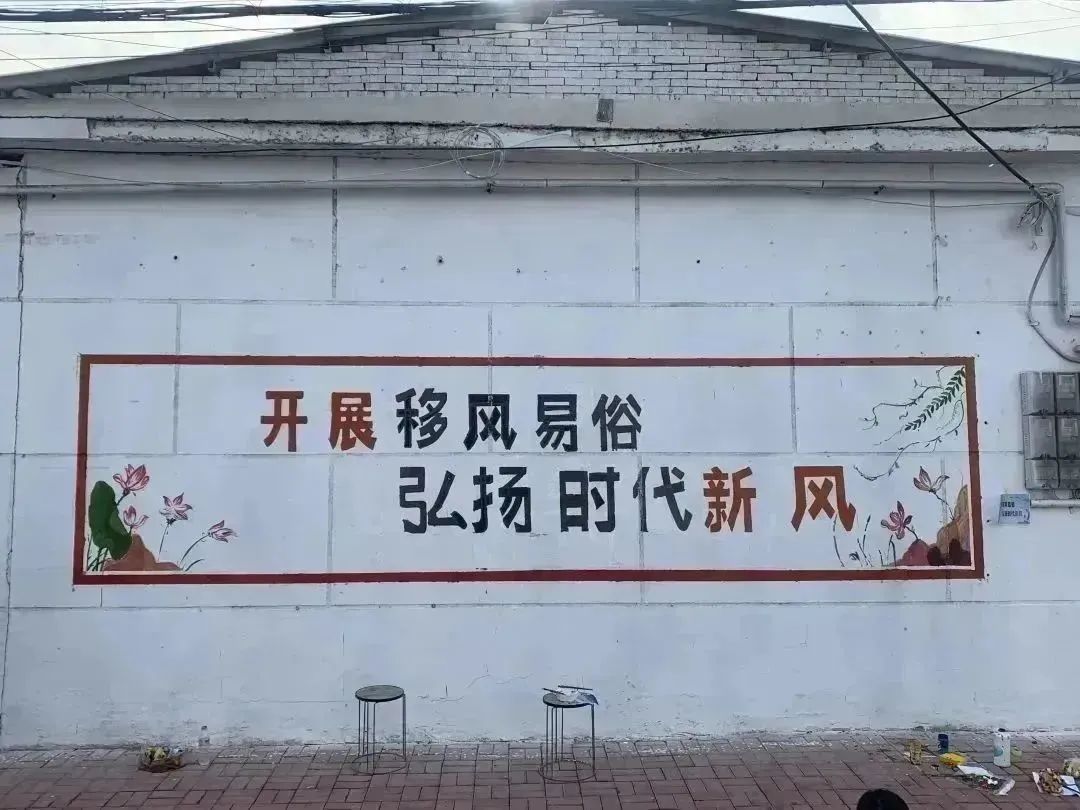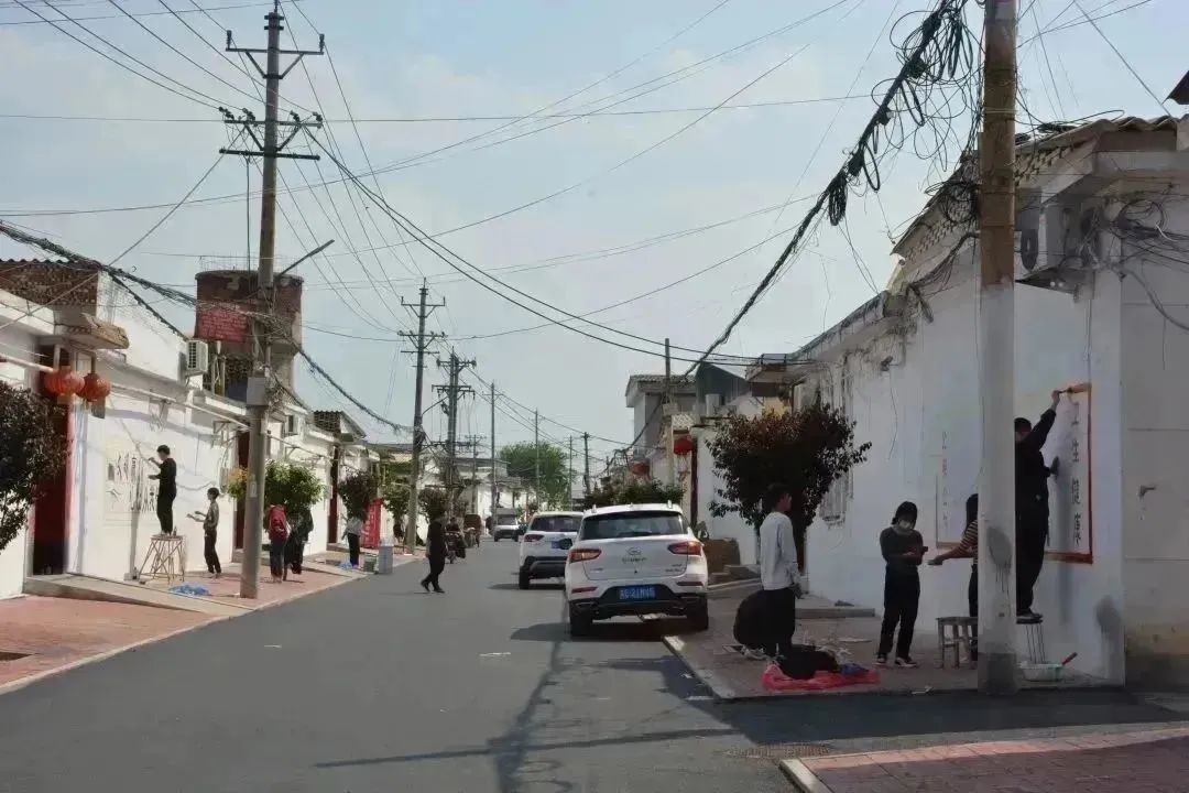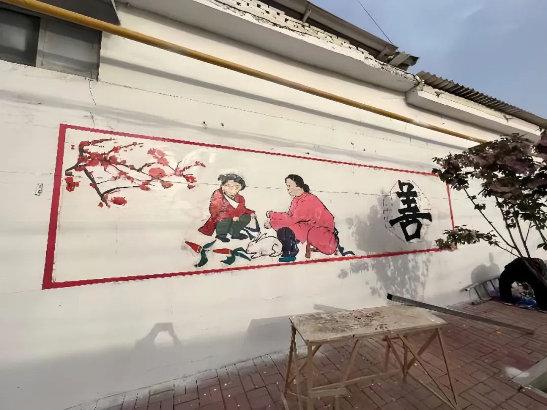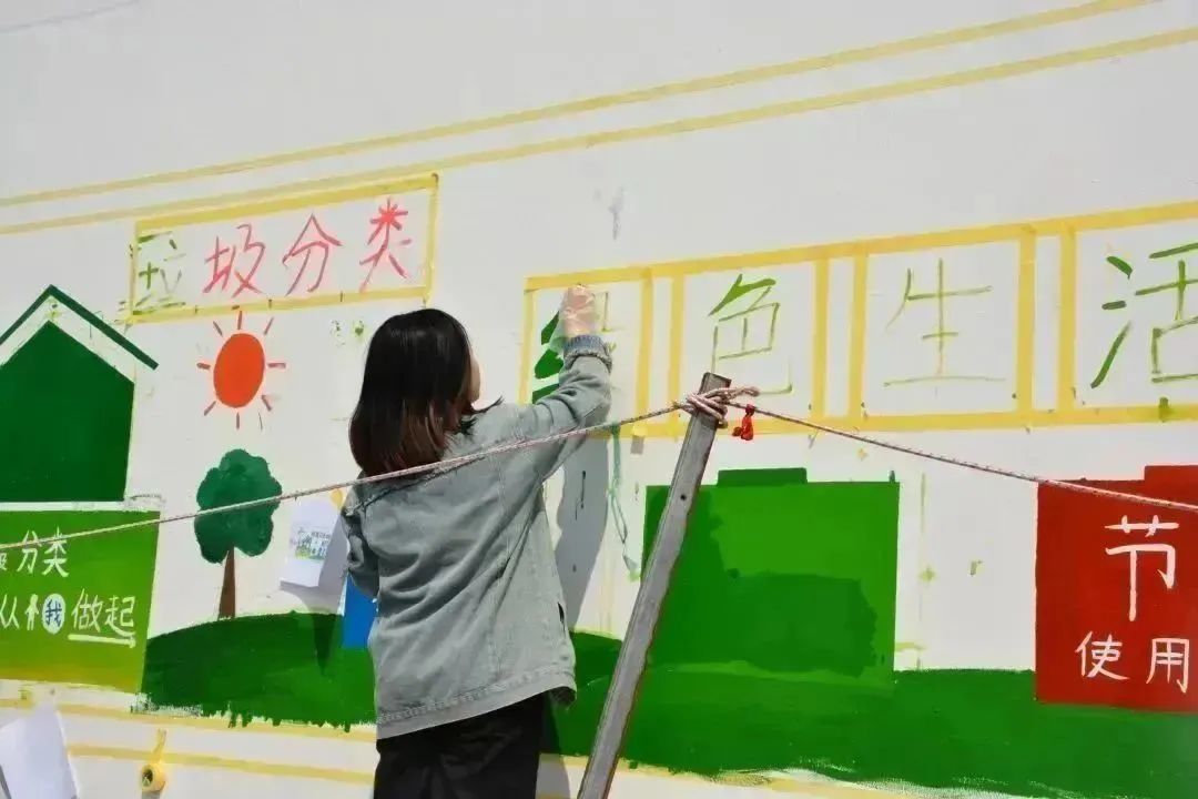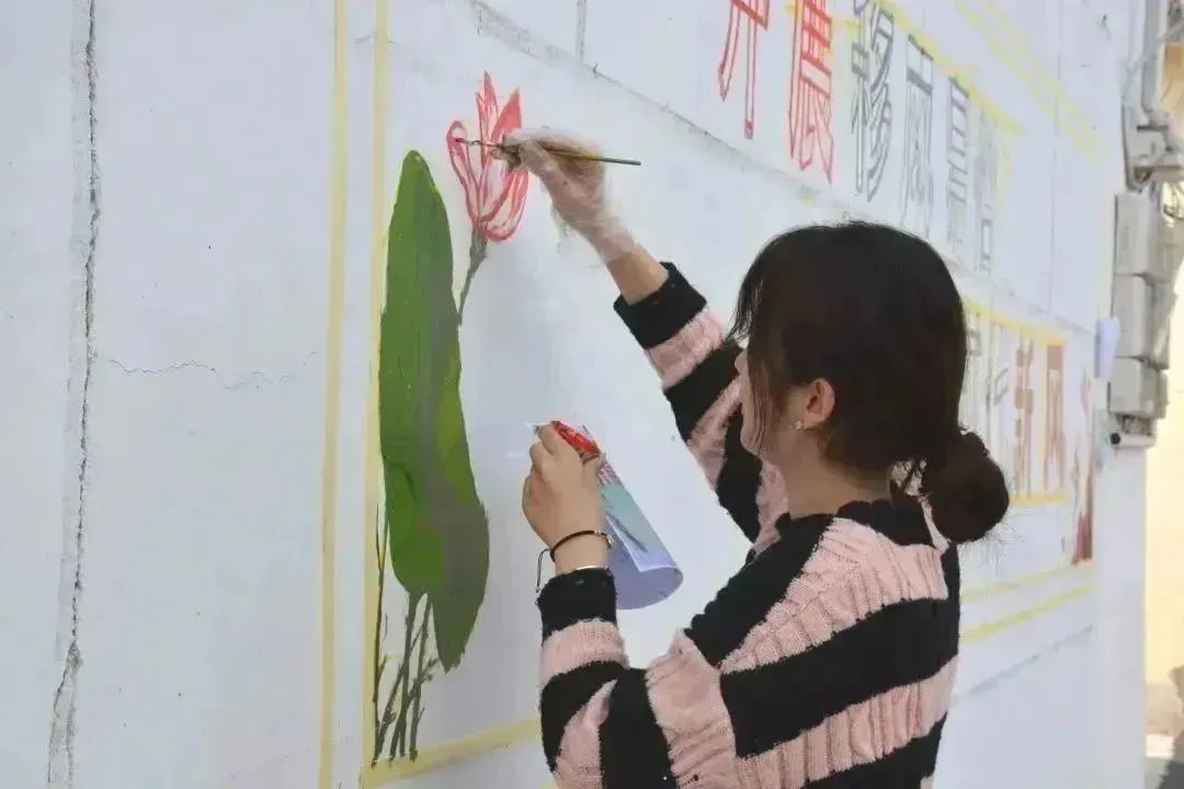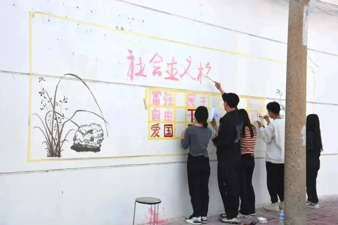 墙绘过程中,同学们分工明确,团结协作,有的调制颜料,有的提笔起型,有的填充颜色,有的描边写字……结合乡村特色和传统文化,充分发挥自身特长,采用彩绘图案和标语相结合的形式,经打样、构图、分工、上色,一墙一文化,一墙一创意,一墙一风景……
