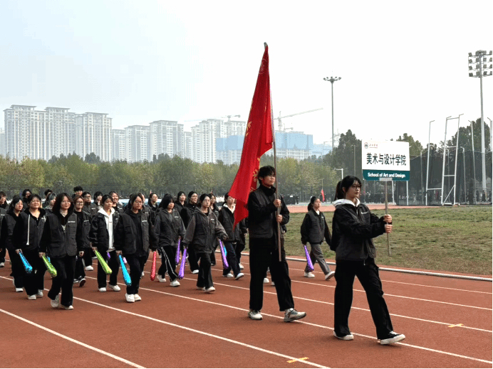 开幕式上,美术与设计学院方阵以严整的队列、昂扬的精神面貌走过主席台。旗手高擎院旗,鲜红旗面在秋风中猎猎招展,恰似美院人赤诚热烈的理想在飞扬;全体队员身着统一队服,步伐铿锵,目光如炬,以整齐划一的节奏诠释着“团结如一人”的集体信念。