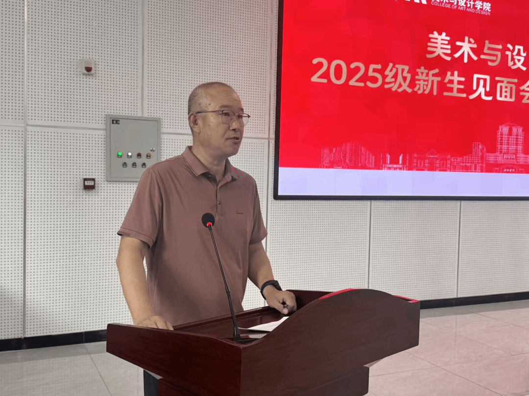 大会在庄严的国歌声中拉开帷幕。院长韩壮教授首先代表学院致辞,全面介绍了学院的办学历史、师资力量与学科优势。对新生提出四点期望:明确目标,将个人理想融入社会需求;深耕专业,锤炼“道器并举、艺工融合”的过硬本领;突破边界,培养跨学科探索精神;勇担使命,以艺术服务国家文化创新与美好生活。 他鼓励新生以“匠心”守艺、以“创新”破局,在传承中华优秀传统文化中书写青年担当。