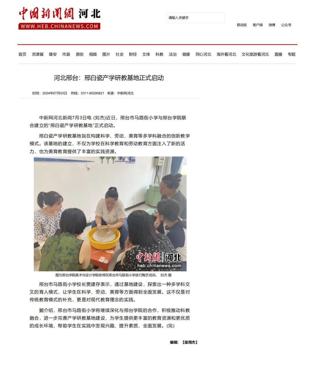 2024年7月,学院与马路街小学联合建立了“邢白瓷产学研教基地”,组织相关专业教师深入马路街小学为美术教师开展培训,为马路街小学美育注入了新的活力,也延展了我校教育部中华优秀传统文化传承基地(邢窑白瓷)的辐射和影响,相关活动在中国新闻网河北进行了报道。