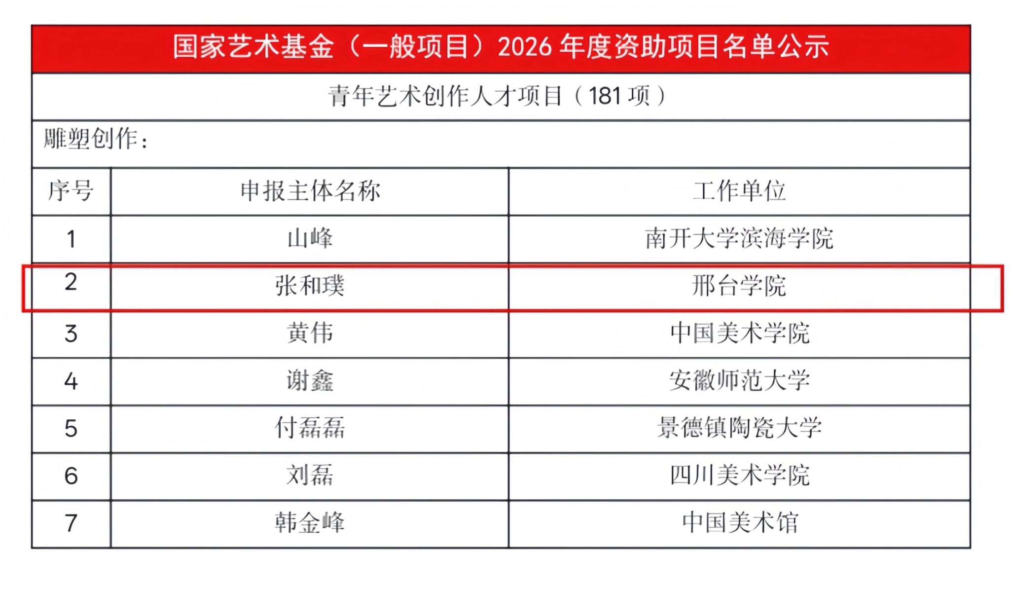 喜讯传来,振奋人心!近日,国家艺术基金管理中心公示《国家艺术基金(一般项目)2026年度资助项目名单》,我院张和璞老师成功获批“青年艺术创作人才项目”,实现了我院在国家艺术基金项目上的历史性突破!