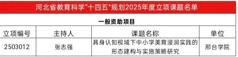 2025年12月5日,河北省教育厅公布《河北省教育科学“十四五”规划2025年度立项课题名单》(冀教院〔2025〕2号),我院张志强副教授主持的《具身认知视域下中小学美育浸润实践的形态建构与实施策略研究》成功获批一般资助项目,实现我院省级教育科学规划课题连续三年立项的佳绩。